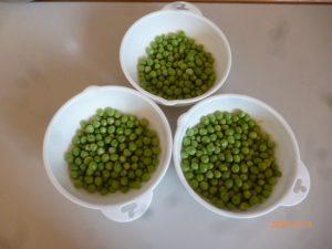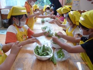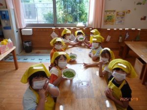その後にグリンピースの皮むきを行いました。 「中からたくさん出てきた!」「全部で何個あるのかな?」とグリーンピースに興味津々な様子が見られました。だんだんとコツを掴めてきたようで、上手に皮むきを進めていました。     みんなが頑張って皮をむいてくれたグリーンピースは、翌日の給食で「グリンピースご飯」に使用しました。 次回のクッキングも楽しみです♪